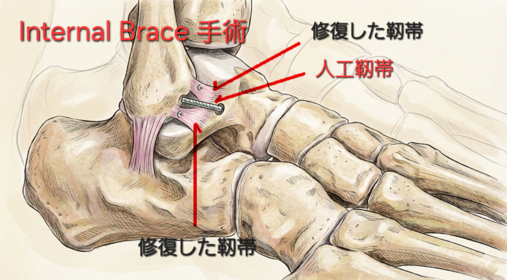 上記のような治療を行ったとしても疼痛や足関節不安定性などの足関節周囲の症状が残存する場合、また受傷直後の損傷が強い場合は手術療法が必要となります。