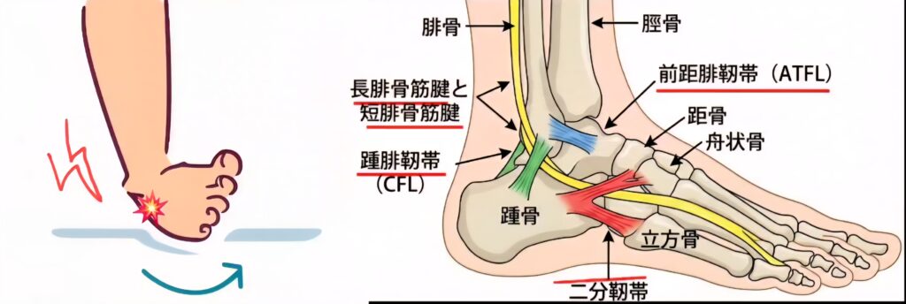 受傷時に損傷する組織としては、前距腓靭帯や踵腓靭帯、長・短腓骨筋腱、二分靭帯などの足関節外側に位置する組織が代表的です。