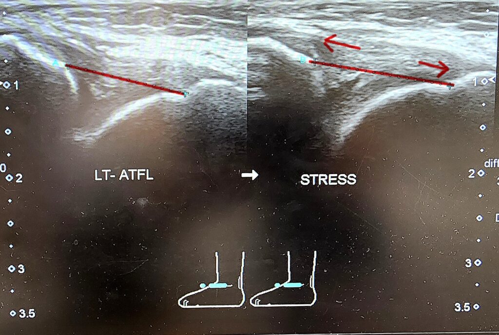 前に引き出す動き(前方引き出しテスト=Anterior Drower Test)、内側に捻る動き(内反ストレステスト=距骨傾斜角 Talar Tilt Angle)で靭帯の損傷の有無や程度を判断します。前方引き出しテストでは靭帯の伸びが4mm以下、距骨傾斜角では5°以下が正常です。